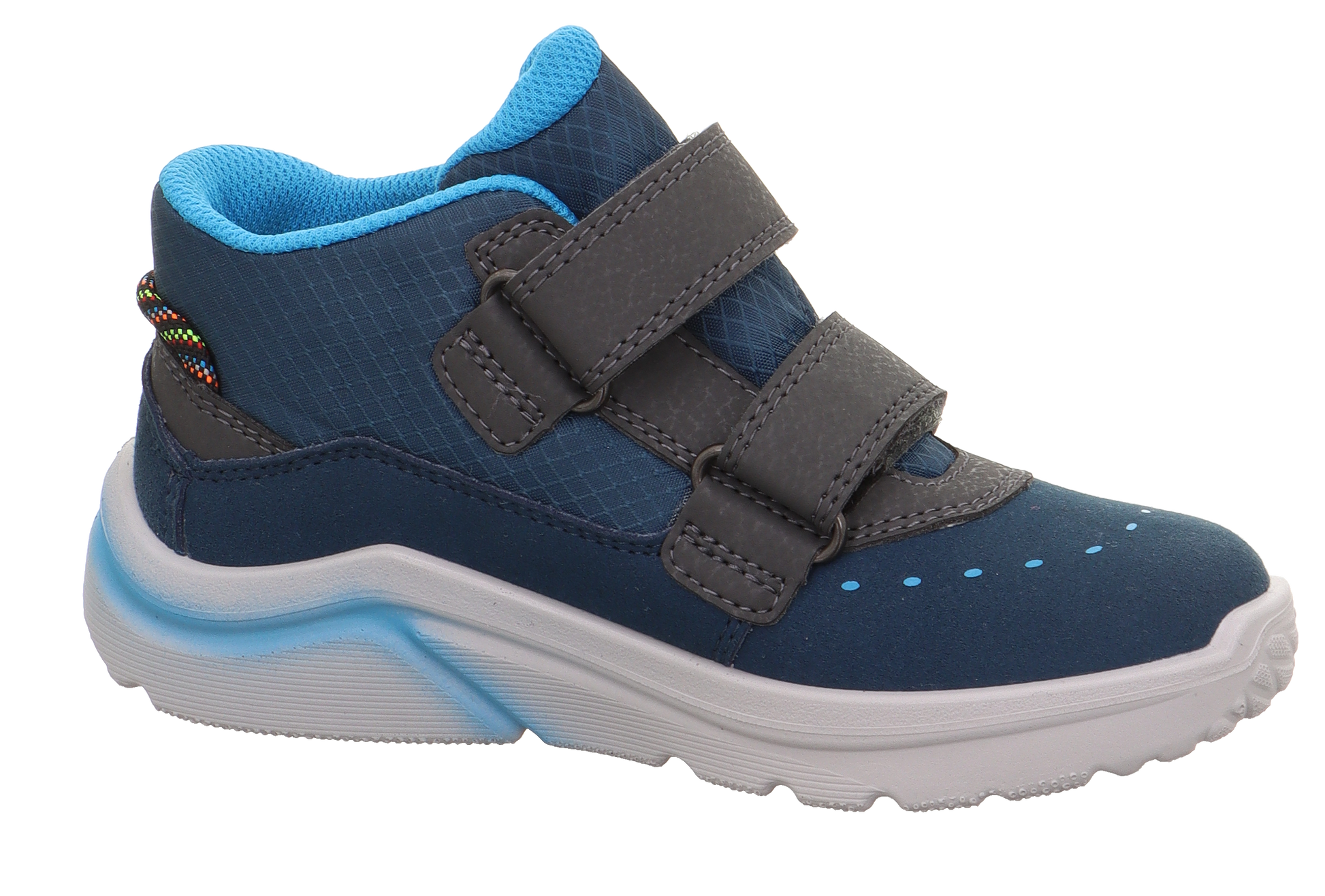 Superfit Kicks is a waterproof trainer in blue and light blue detail. Made with Gore-Tex, making it fully waterproof and breathable. Perfect for all year! as the breathable membrane helps cool the feet down on those hotter days.